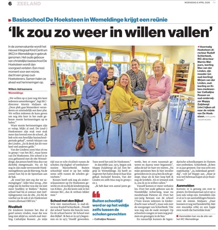 Ooit was jij onderdeel van CBS de Hoeksteen. Een tijd vol leuke en/of minder leuke herinneringen. Tijd voor een reünie! Na de fusie van 1 augustus 2023 met OBS Wemeldinge, zijn we verdergegaan als IKC Wemeldinge. Na de zomer van 2026 zullen we onze intrek nemen in het nieuwe gebouw.